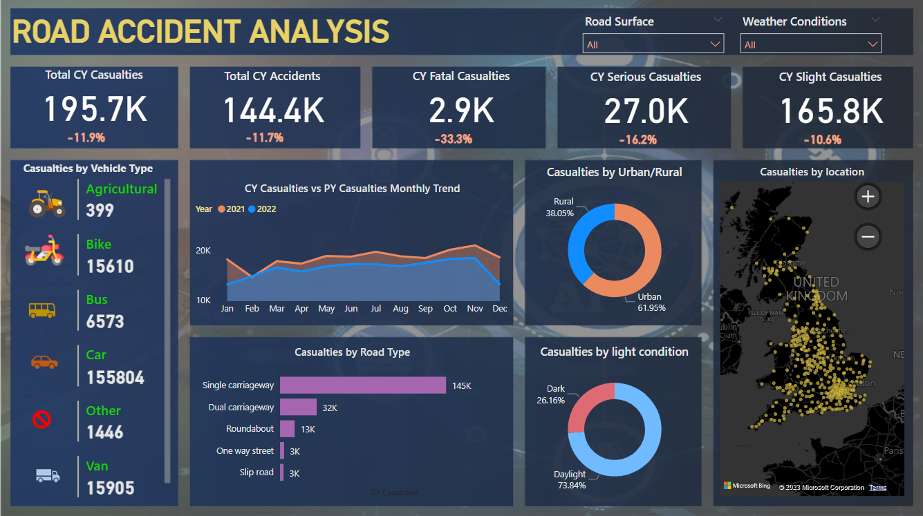 Total casualties, accidents, and YOY growth; Casualties by accident severity and YOY change; Casualties by vehicle type for the current year; Monthly trends in casualties for current and previous years; Casualties by road type in the current year; Casualties by location and day/night for the current year; Total casualties and accidents by location.
